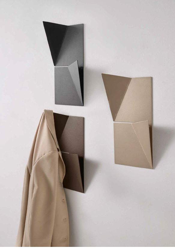 Complemento d’arredo in metallo, composto da due elementi rettangolari attraversati da un taglio orizzontale. Il dettaglio inclinato rompe la rigidità del rettangolo, fungendo da elegante appendiabiti. Disponibile in un’unica dimensione e in tre varianti colore.