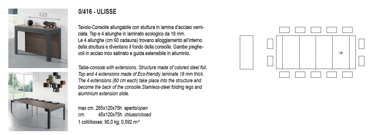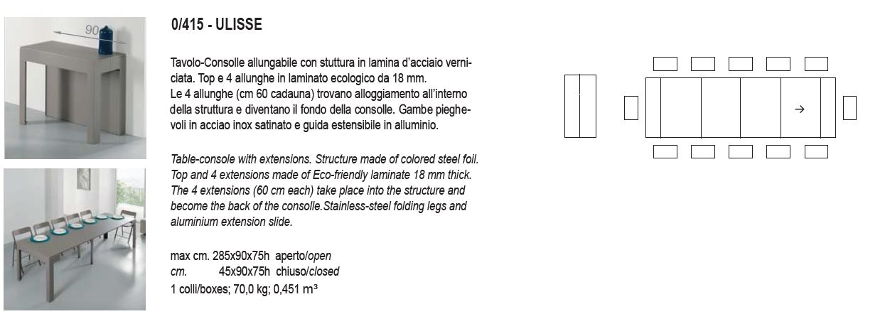 CONSOLLE TAVOLO ULISSE PEZZANI 90X45 ALLUNGABILE 285 FINITURE VARIE