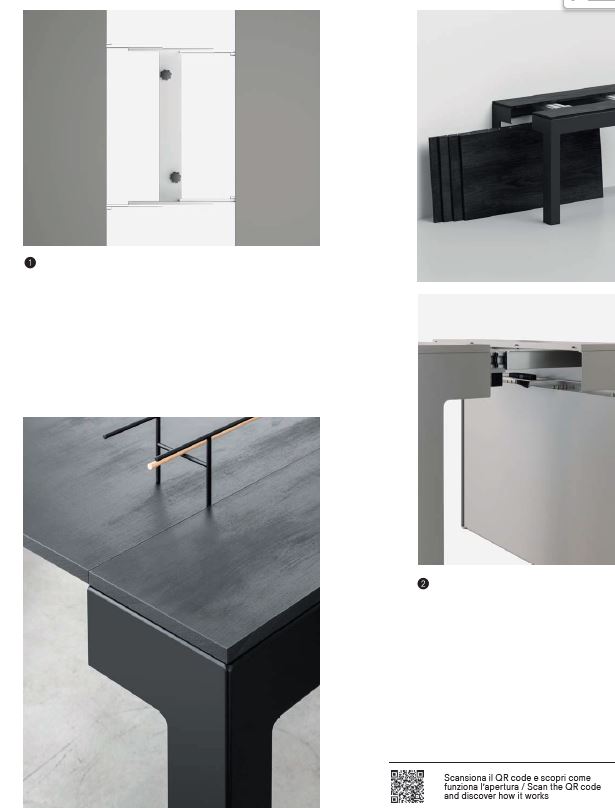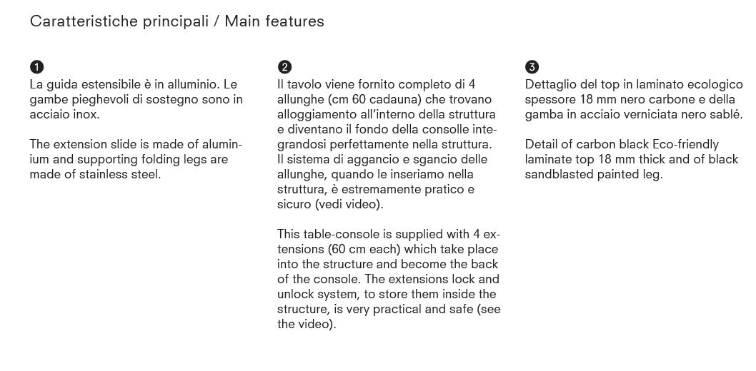 IL TAVOLO VIENE FORNITO COMPLETO DI 4 ALLUNGHE (CMM.60 CADAUNA) CHE TROVANO ALLOGGIAMENTO ALL'INTRNO DELLA STRUTTURA E DIVENTANO IL FONDO DELLA CONSOLLE INTEGRANDOSI PERFETTAMENTE NELLA STRUTTURA