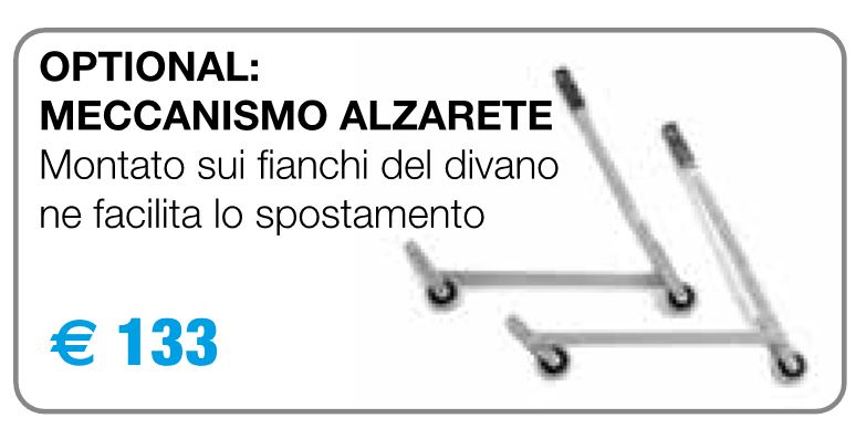 OPTIONAL SU RICHIESTA CON MAGGIORAZIONE: MECCANISMO ALZARETE MONTATO SUI FIANCHI DEL DIVANO, NE FACILITA LO SPOSTAMENTO