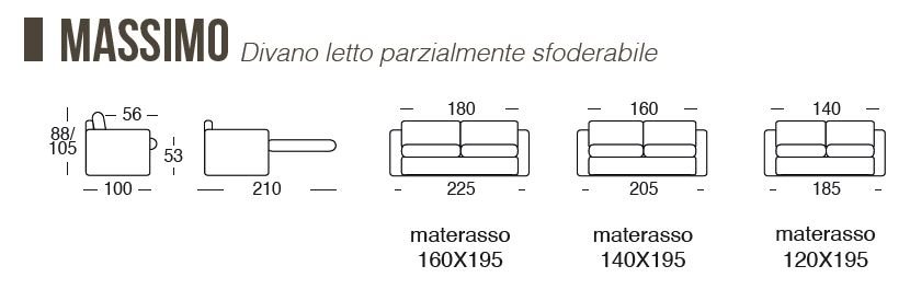DISPONIBILE IN 3 MISURE: 225 CON MATERASSO DA 160X195, 205 CON MATERASSO DA 140X195 E 185 CON MATERASSO DA 120X195
