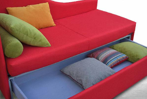 DIVANO TRASFORMABILE LETTO SPONDA SAGOMATA, CON CASSETTONE CONTENITORE E COPRIMATERASSO