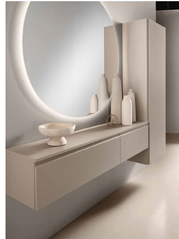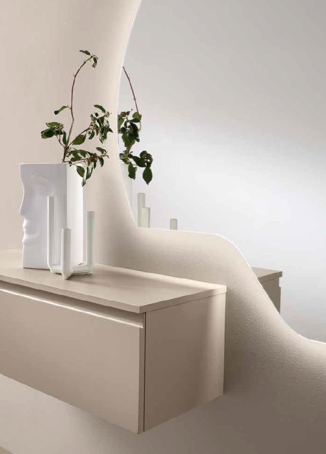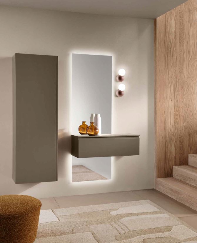 L’intera collezione è realizzata in nobilitato nei toni caldi del tortora, marrone, antracite.