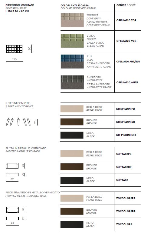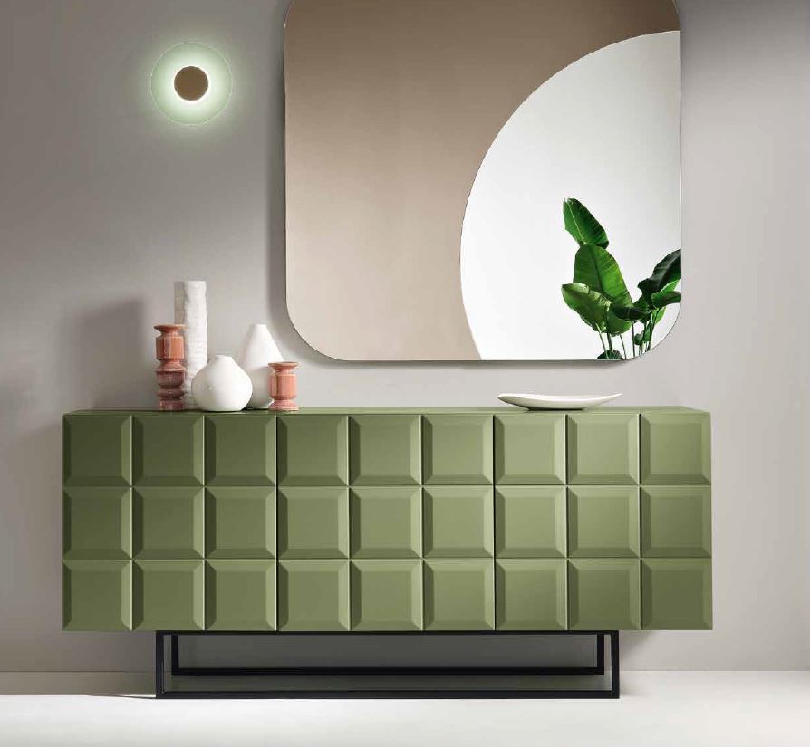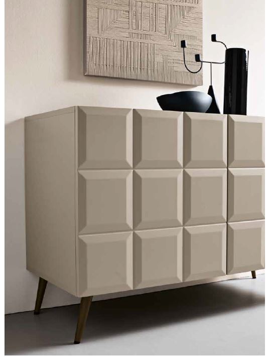 Ofelia è una madia che gioca con la geometria e conquista con il dettaglio. Le ante in MDF disegnano una griglia di rilievi quadrati, come una raffinata tavoletta di cioccolato, che dona ritmo e tridimensionalità alla superficie. La scocca in nobilitato ha come optional un top in vetro specchiato, bronzo o fumè, per aggiungere un tocco ancora più sofisticato. La base in metallo verniciato, proposta in tre varianti di forma, completa un arredo dalla personalità decisa e dal gusto contemporaneo.