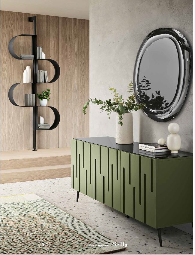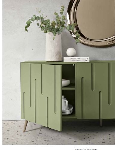 Scilla è una madia dal carattere scultoreo, in cui il design incontra la materia. Le ante in MDF sono percorse da incisioni verticali che salgono