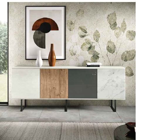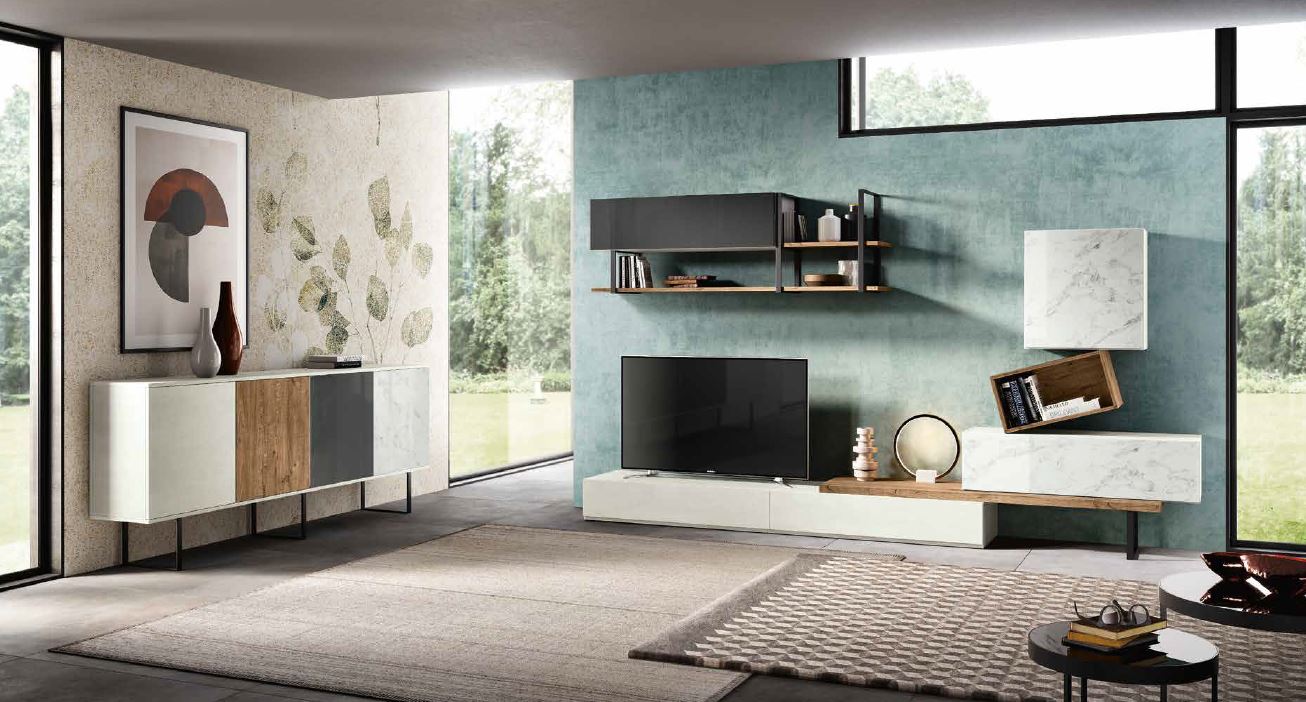 IN FOTO: BIANCO CALCE, ROVERE NORDICO, VETRO ANTRACITE, VETRO MARMO WHITE