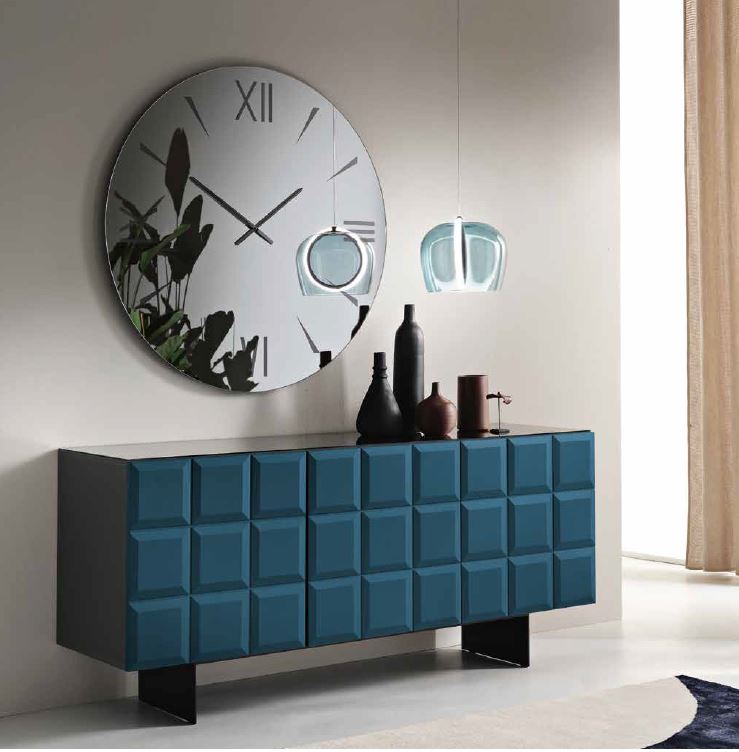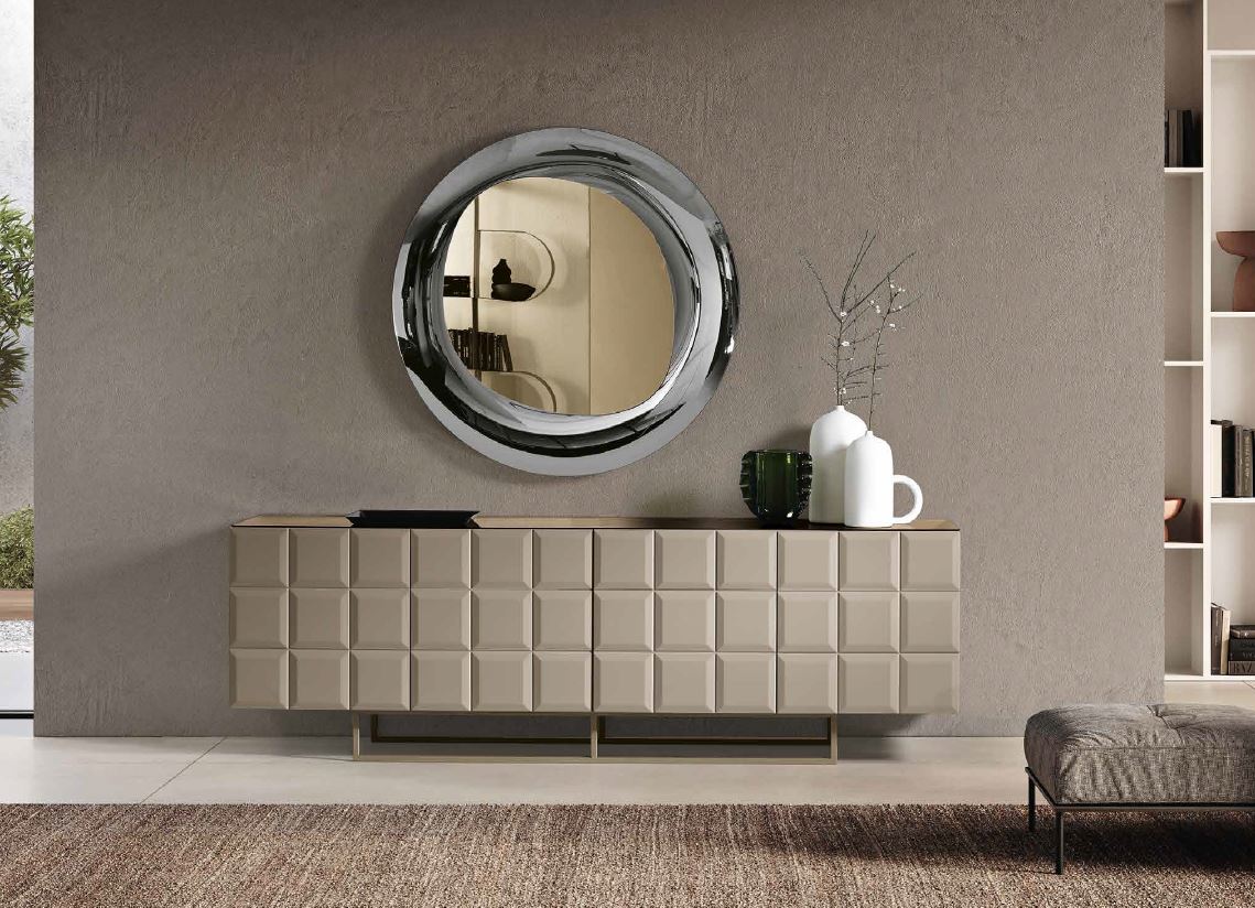 Ofelia è una madia che gioca con la geometria e conquista con il dettaglio. Le ante in MDF disegnano una griglia di rilievi quadrati, come una raffinata tavoletta di cioccolato, che dona ritmo e tridimensionalità alla superficie. La scocca in nobilitato ha come optional un top in vetro specchiato, bronzo o fumè, per aggiungere un tocco ancora più sofisticato. La base in metallo verniciato, proposta in tre varianti di forma, completa un arredo dalla personalità decisa e dal gusto contemporaneo.