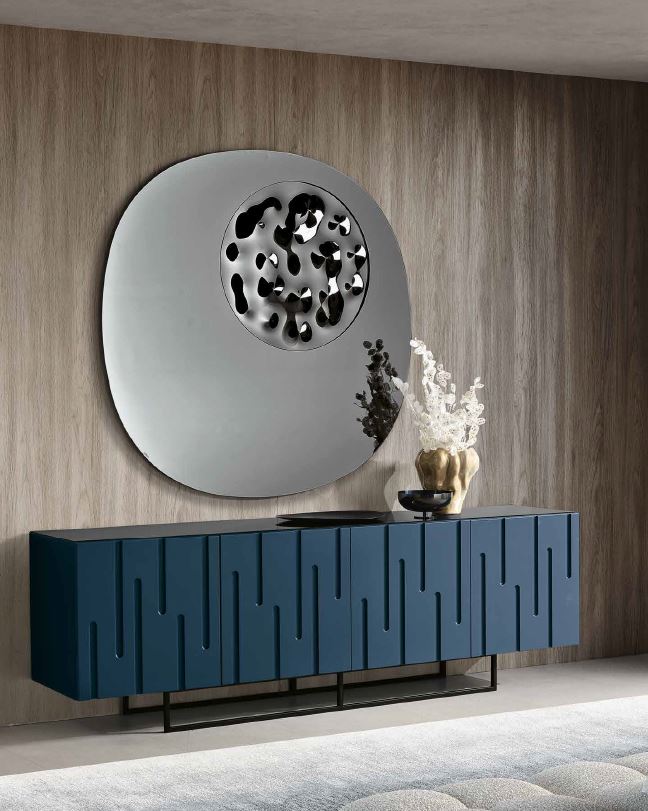 Scilla è una madia dal carattere scultoreo, in cui il design incontra la materia. Le ante in MDF sono percorse da incisioni verticali che salgono