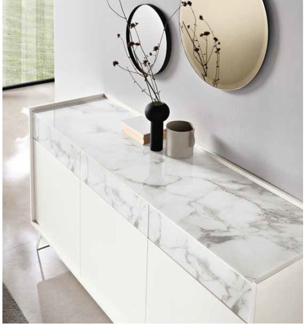 MADIA BIANCO OPACO CON CASSETTI E PIANO VETRO EFFETTO CALACATTA NATURALE