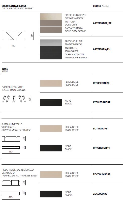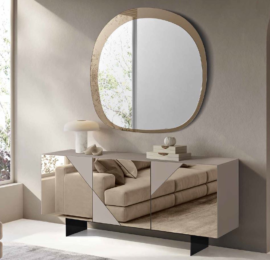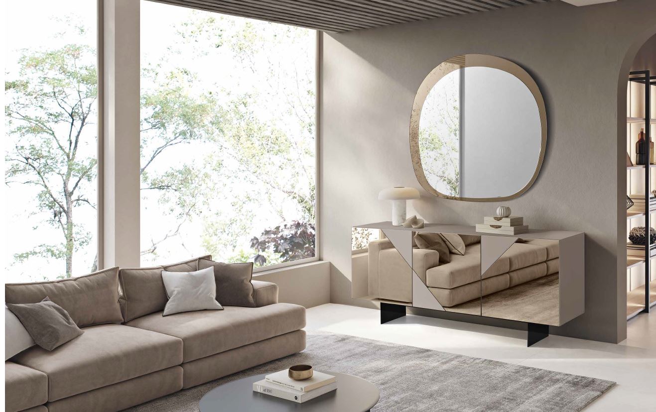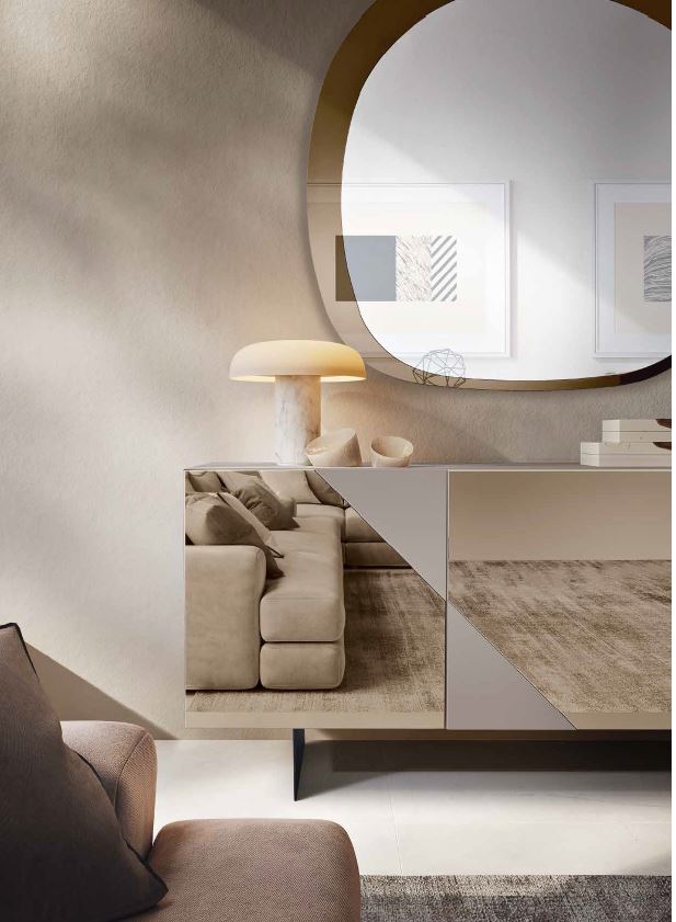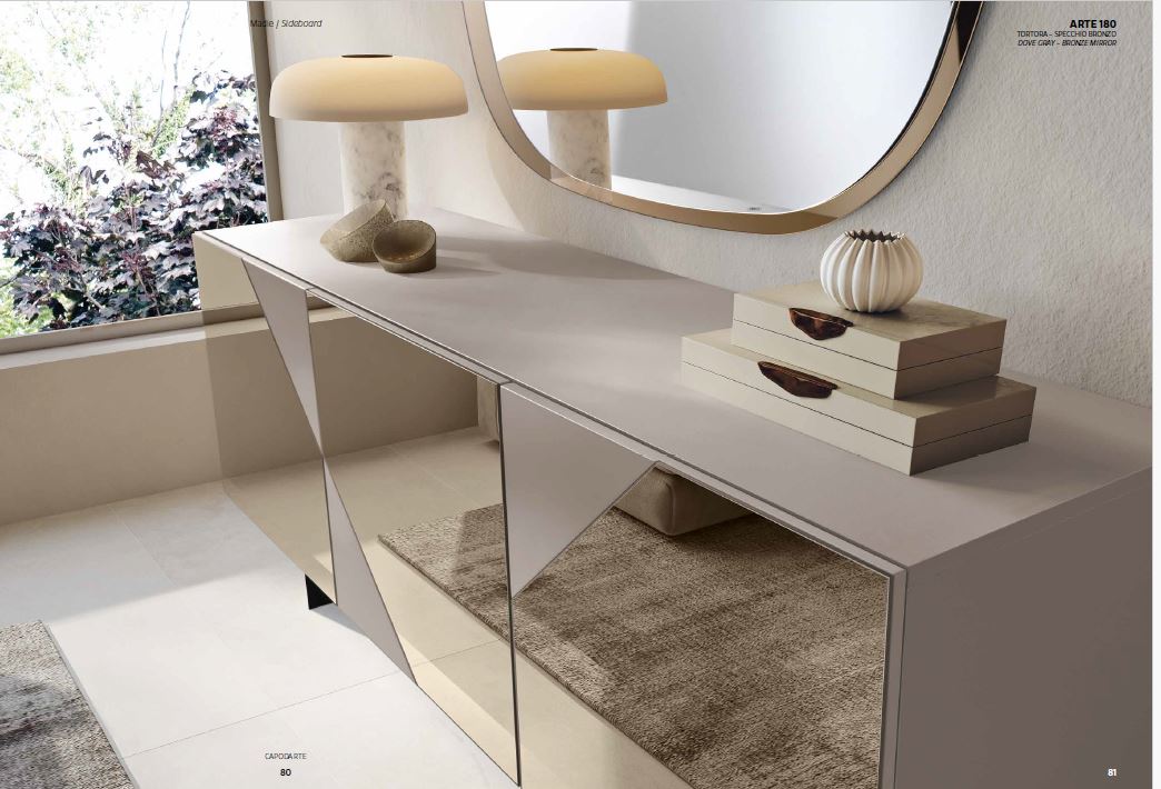 Arte è una madia che cattura lo sguardo grazie alla forza grafica delle sue superfici a specchio. Le ante in MDF, rivestite da vetri specchiati che alternano geometrie lucide e opache, disegnano un motivo elegante e contemporaneo. La scocca in nobilitato, coordinata in tinta, si completa con una base in metallo verniciato, proposta in tre differenti modelli. Disponibile in due misure – 120 e 180 cm – Arte riflette lo stile in ogni dettaglio.