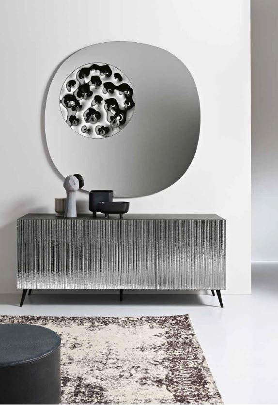 Le ante con apertura push pull sono rivestite in vetro rigato bronzo o fumè.