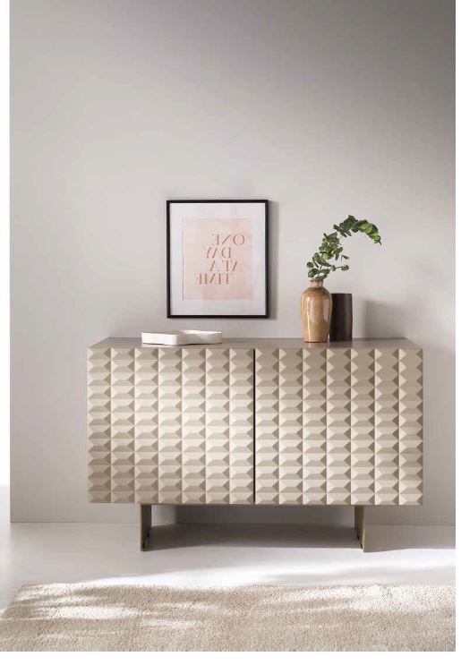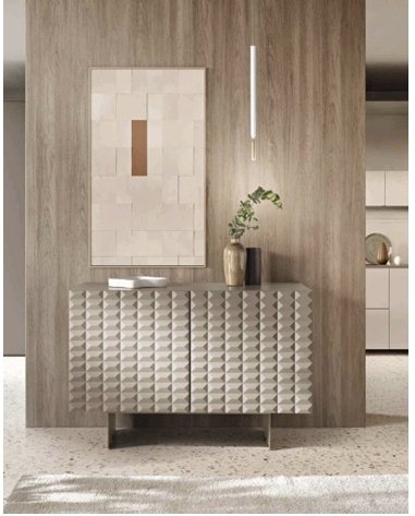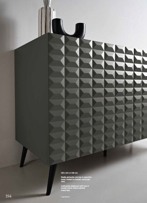 Un omaggio al patrimonio rchitettonico italiano, questa madia reinterpreta con eleganza la celebre facciata del Palazzo dei Diamanti di Ferrara. Le ante in MDF presentano una texture geometrica tridimensionale che richiama i rilievi a punta di diamante, creando un affascinante gioco di luci e ombre. La scocca in nobilitato si combina a una base in metallo verniciato disponibile in tre different modelli, per un risultato grafico e contemporaneo. Come optional, il top può essere arricchito da un elegante vetro a specchio, bronzo o fumé, per un ulteriore tocco di stile e raffinatezz Una madia scenografica, capace di portare carattere in ogni Un omaggio al patrimonio architettonico italiano, questa madia reinterpreta con eleganza la celebre facciata del Palazzo dei Diamanti di Ferrara. Le ante in MDF presentano una texture geometrica tridimensionale che richiama i rilievi a punta di diamante, creando un affascinante gioco di luci e ombre. La scocca in nobilitato si combina a una base in metallo verniciato disponibile in tre differenti modelli, per un risultato grafico e contemporaneo. Come optional, il top può essere arricchito da un elegante vetro a specchio, bronzo o fumé, per un ulteriore tocco di stile e raffinatezza. Una madia scenografica, capace