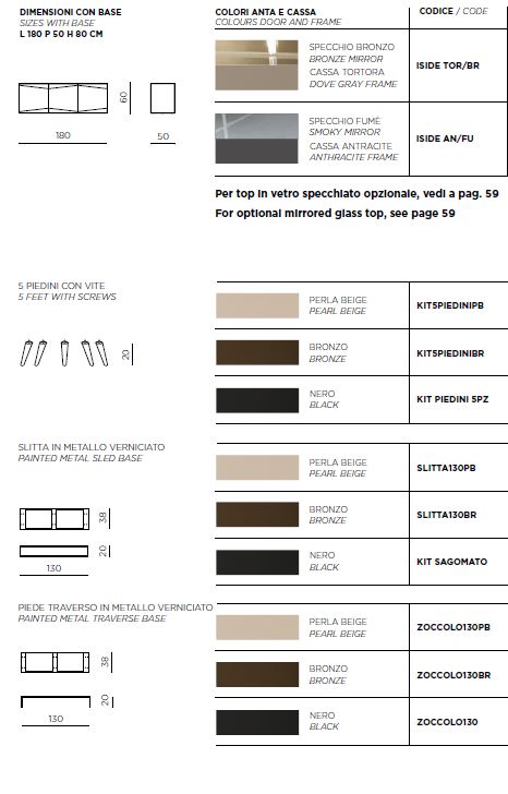 Iside è una madia che riflette eleganza e personalità, grazie al raffinato contrasto tra materiali e finiture. La scocca in nobilitato accoglie ante in nobilitato rivestite in vetro specchio bronzo o fumé, incise con linee che si incrociano in un disegno grafico che ne valorizza lasuperficie.  Disponibile in due varianti cromatiche, tortora o antracite, con specchi coordinati in tonalità, Iside si adatta con stile a interni sofisticati. La base in metallo verniciato, proposta in tre diversi modelli, completa il design con una nota contemporanea e leggera.