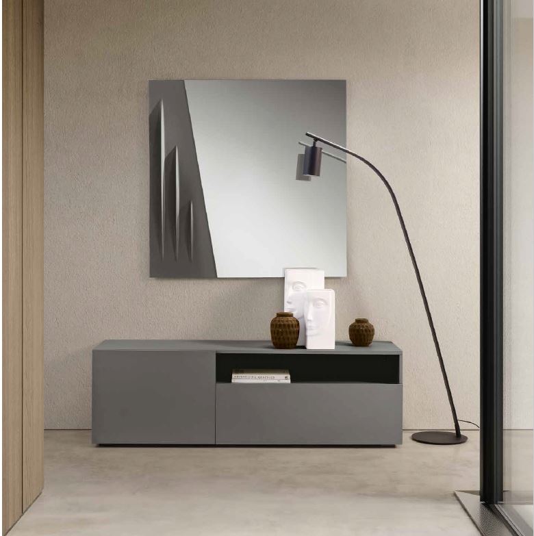 Madia in nobilitato dal design lineare, con un ampio vano a giorno dalla duplice funzione estetica e pratica. Lo spazio contenitivo è suddiviso tra un’anta a battente con ripiano centrale fisso e apertura push-pull e un’anta a ribalta con apertura a pistone. La madia offre una doppia configurazione: ancorata a parete nella versione sospesa oppure posizionata a