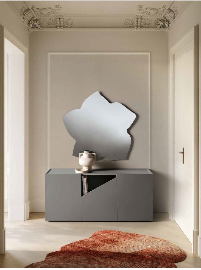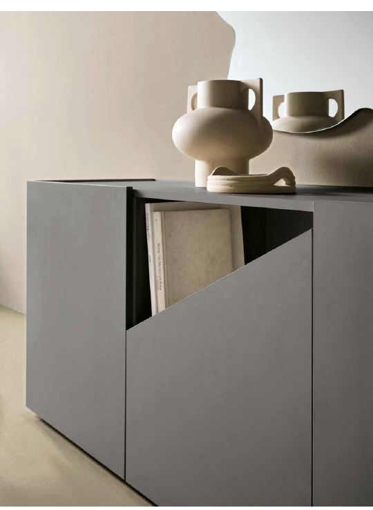 Madia in nobilitato caratterizzata da un taglio diagonale nell’anta centrale che crea un vano a giorno triangolare. È provvista di tre pratiche ante con all’interno un ripiano fisso per soluzioni contenitive essenziali e versatili. La madia è personalizzabile