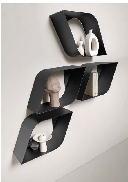 Mensola in metallo dalle linee fluide la cui superficie si incurva a creare uno spaio interno dove ospitare oggetti. Ideata per riprodurre composizioni dinamiche e decorative, rappresenta un elemento d’arredo minimalista. Disponibile in un’unica dimensione e in tre varianti colore.