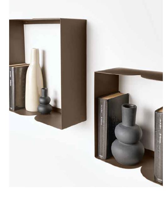 Wall-mounted shelf with a simple metal structure, made distinctive by curved details. Available in various sizes and colors.