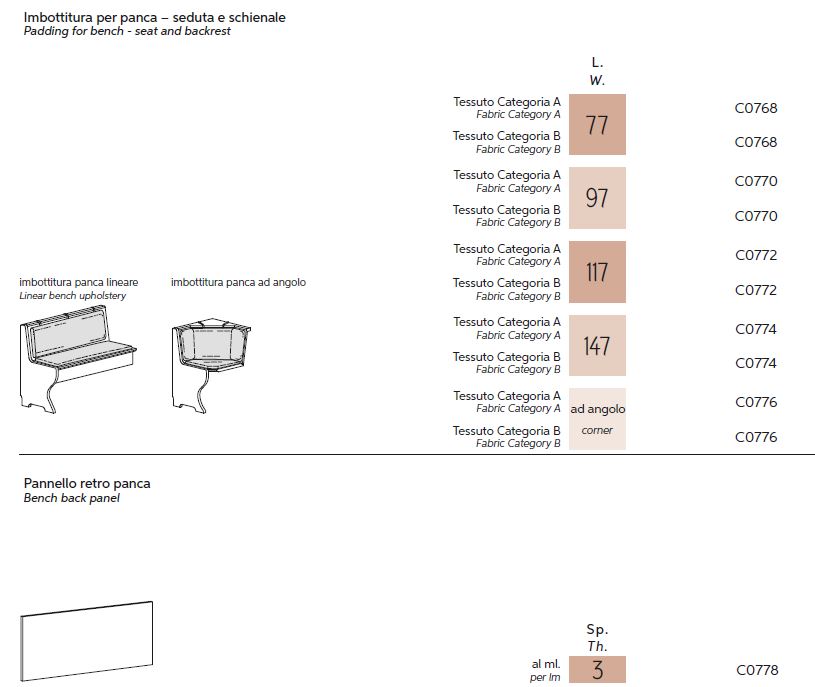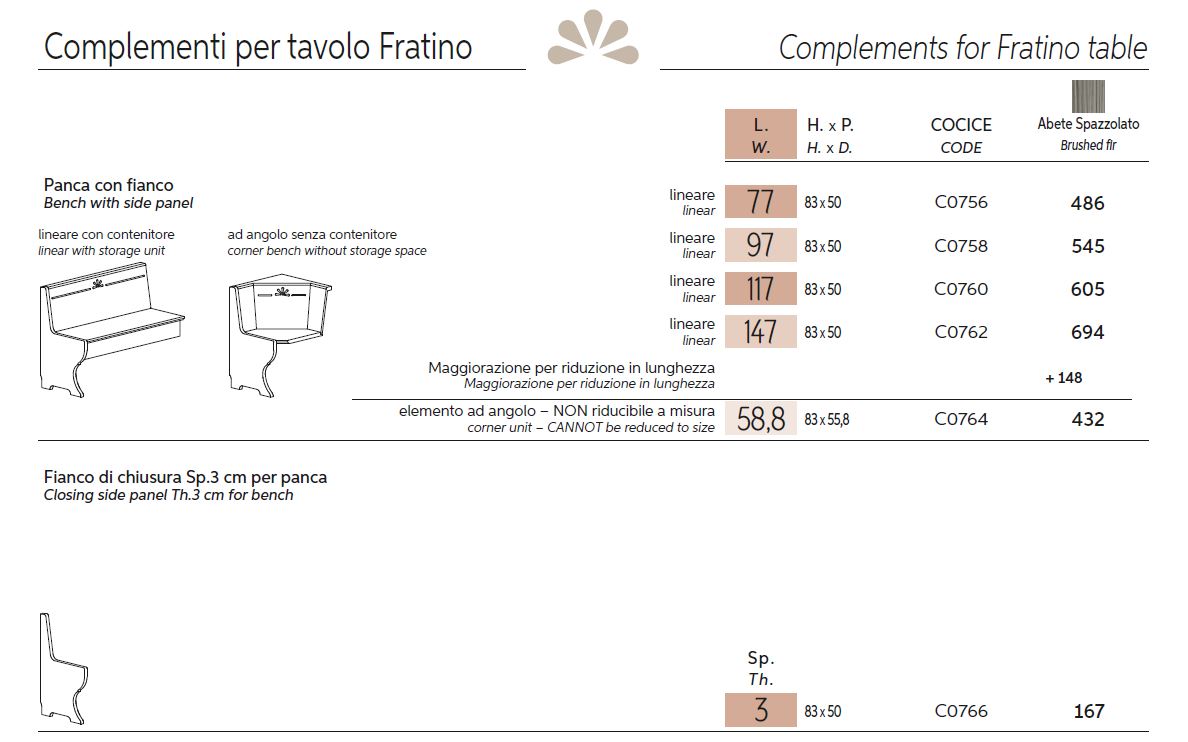 PANCA PER TAVOLO FRATINO CALESELLA, MISURE E FINITURE VARIE