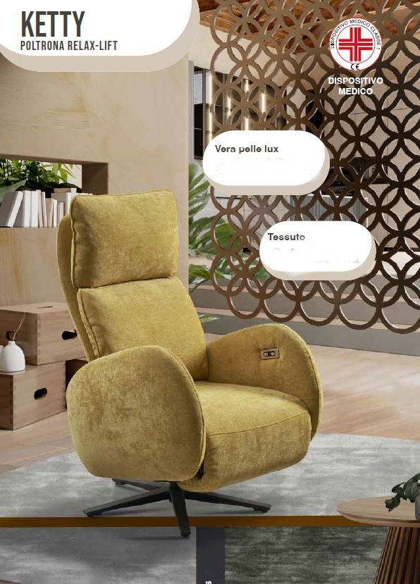 La Poltrona Ketty è una poltrona di design che offre il comfort di una meccanica Emme Relax 2 (alzapersona) con il valore aggiunto di una base girevole