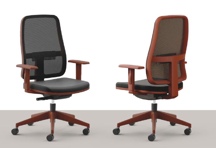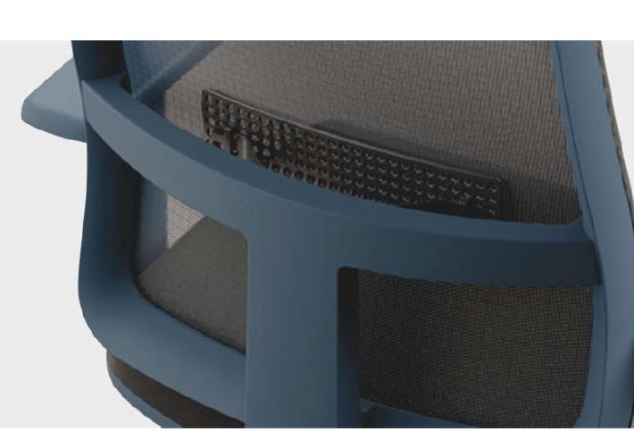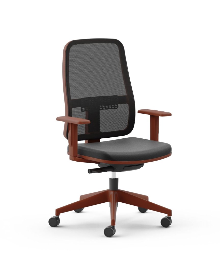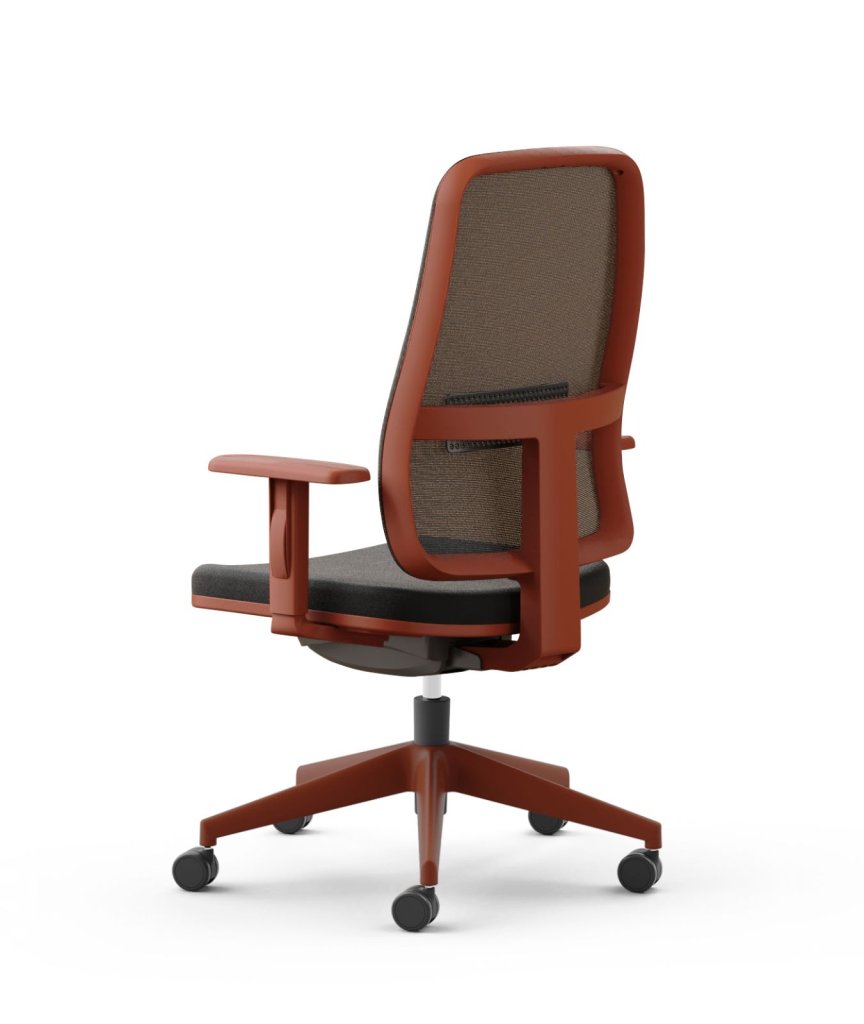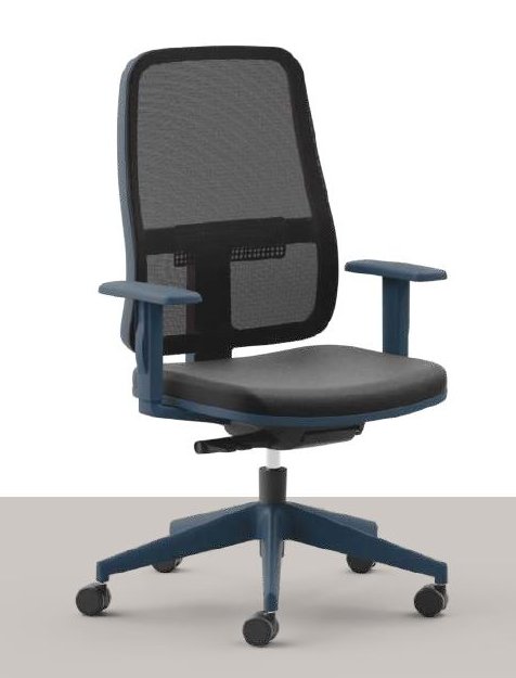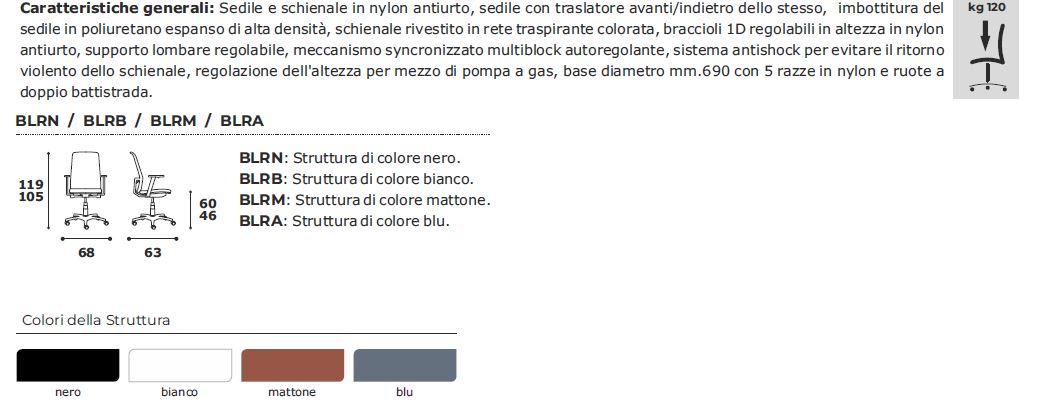 sedile in poliuretano espanso di alta densità, schienale rivestito in rete traspirante colorata, braccioli 1D regolabili in altezza in nylon