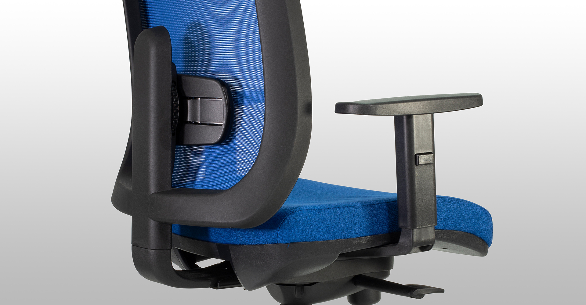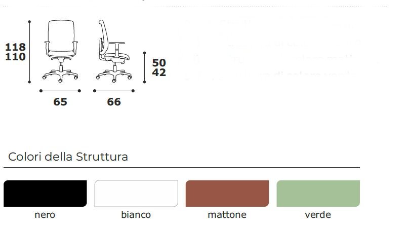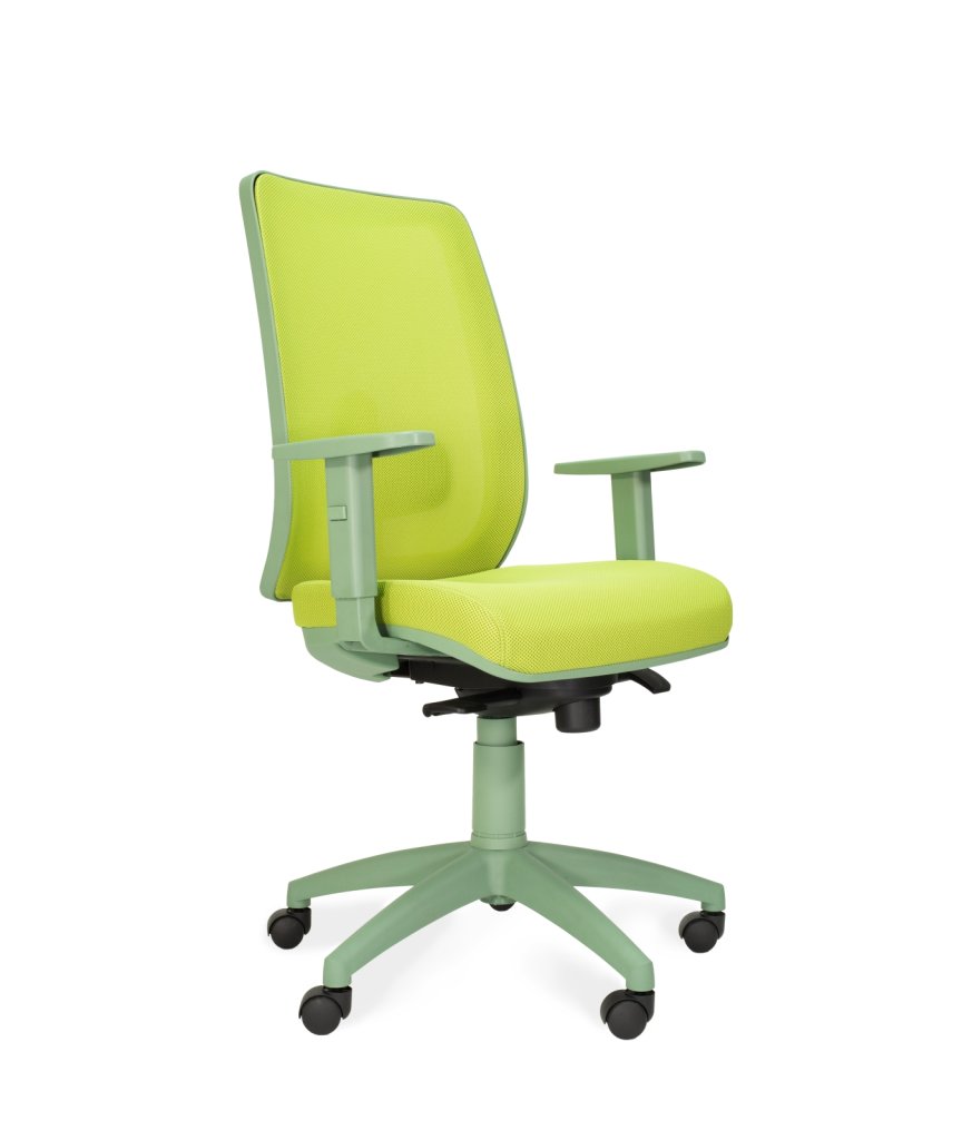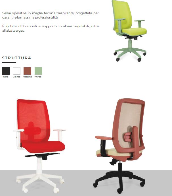 Poltrona operativa con sedile e schienale in nylon antiurto, sedile con interno in multistrato di pioppo e faggio mm 12 e imbottitura in poliuretano espanso di alta densità, schienale rivestito in rete traspirante colorata e regolabile in altezza con meccanismo updown, braccioli 1D regolabili in altezza in nylon antiurto, supporto lombare regolabile, meccanismo syncronizzato multiblock autoregolante, sistema antishock per evitare il ritorno violento dello schienale, regolazione dell'altezza per mezzo di pompa a gas, base 5 razze in nylon con ruote a doppio battistrada