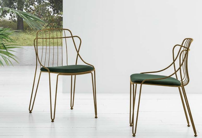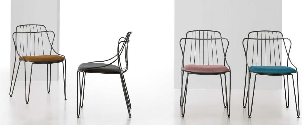 Sedia con struttura in metallo verniciato e seduta rivestita in morbida microfibra effetto velluto.