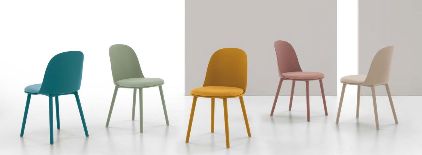 Sedia con struttura in metallo verniciato. Scocca in polipropilene e seduta imbottita e rivestita in morbida microfibra effetto velluto.