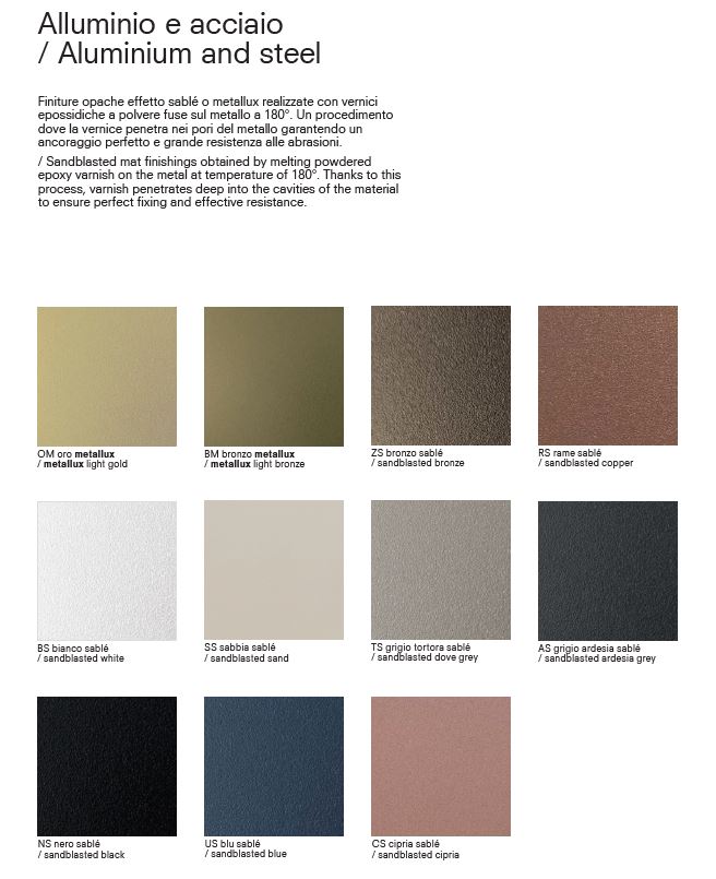 BASI IN METALLO COLORI: GRIGIO ARDESIA, NERO E CON MAGGIORAZIONE SU RICHIESTA BIANCO, SABBIA, GRIGIO ARDESIA, ROSA CIPRIA, ORO METALUX, BRONZO METALUX, RAME, BLU