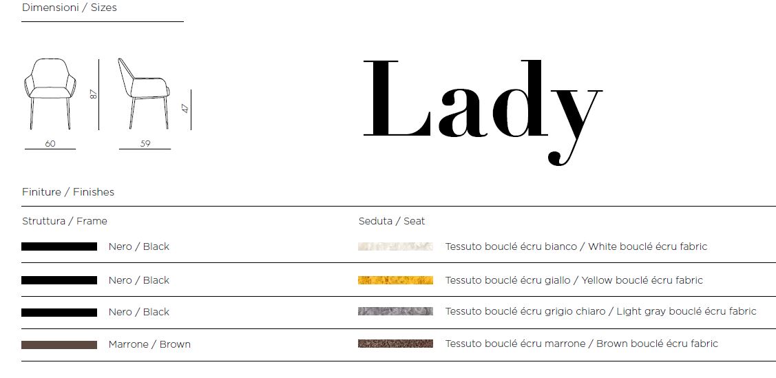 Lady è una sedia con braccioli imbottita in tessuto bouclé écru, dal carattere deciso e dall’estetica compatta. La