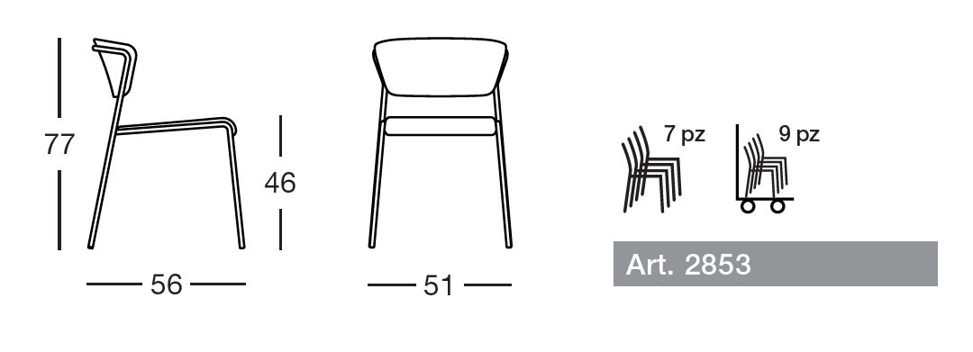 Seduta e schienale imbottiti con anima in multistrato curvato. Struttura a 4 gambe in acciaio tubolare ø mm 16. Impilabile.