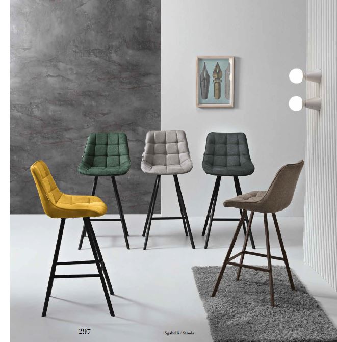 Sgabello con struttura in metallo verniciato e seduta in tessuto imbottito.