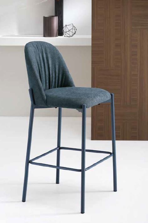 Sgabello imbottito in tessuto con struttura in metallo verniciato.