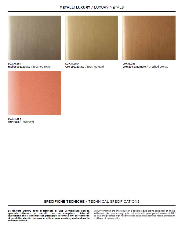 STRUTTURA METALLO NEI COLORI: BIANCO, ANTRACITE, NERO, OTTONE, TITANIO, ORO ANTICO E CON MAGGIORAZIONE SU RICHIESTA LUXURY ORO ROSA COME FOTO