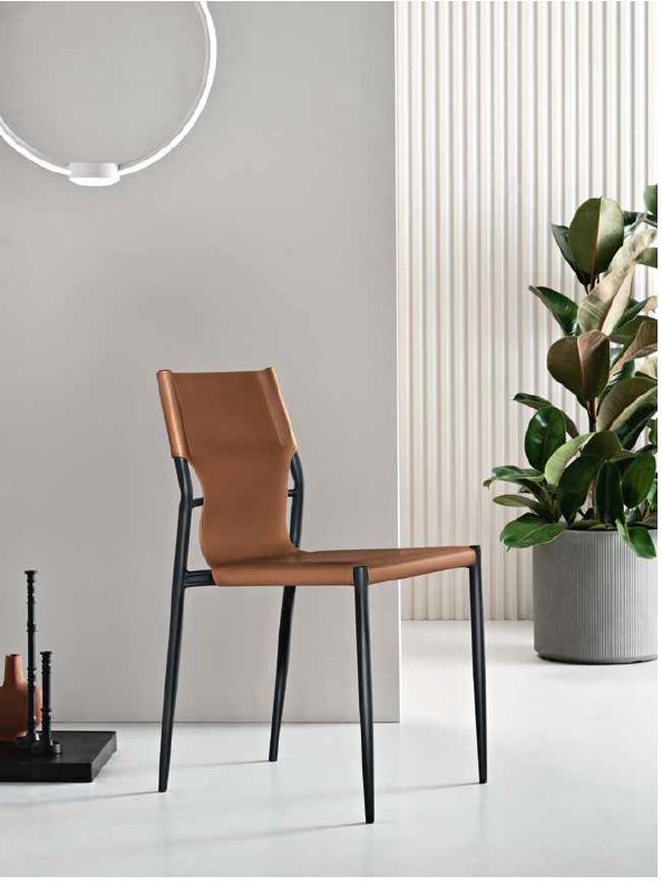 un raffinato gioco di silhouette. Seduta e schienale, rivestiti in similcuoio ad alto spessore e uniti in un unico segno