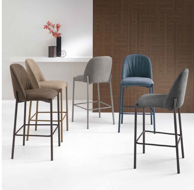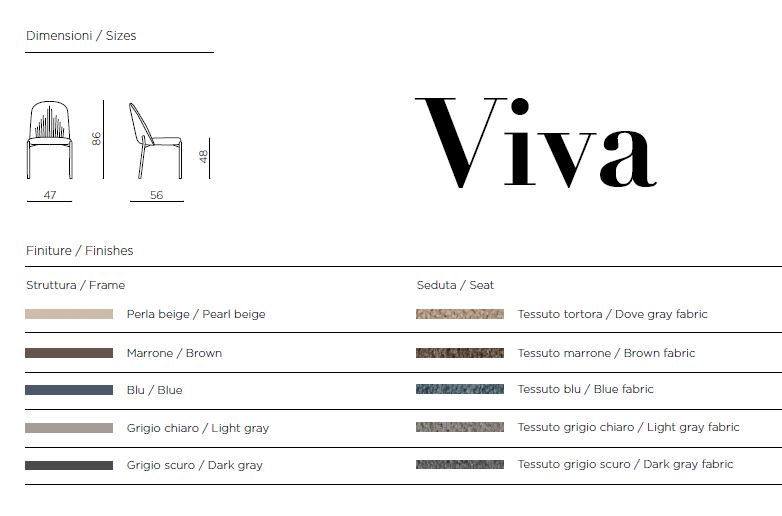 Viva è una sedia imbottita in tessuto con struttura in metallo verniciato, disponibile in diversi colori, pensata per