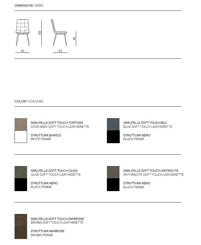 Sedia con struttura in metallo verniciato e seduta in ecopelle effetto soft touch.