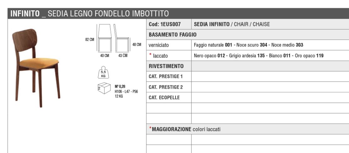STRUTTURA FAGGIO , FONDELLO MULTISTRATO DI FAGGIO, COLORI: FAGGIO NATURALE, NOCE SCURO NOCE MEDIO OPPUREL CON MAGGIORAZIONE SU RICHIESTA LACCATO OPACO COLORI: NERO OPACO, GRIGIO ARDESIA, BIANCO, ORO OPACO