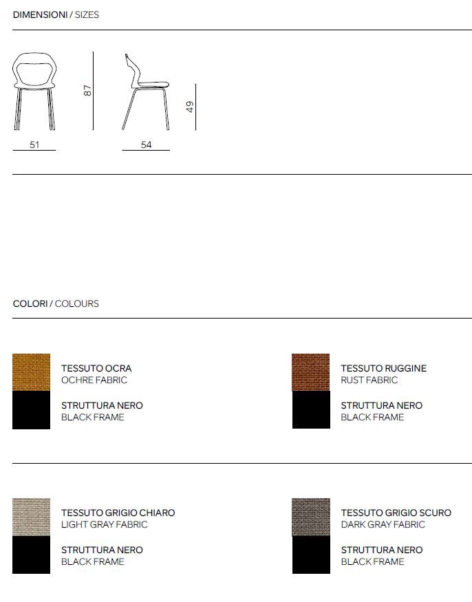 Sedia imbottita in tessuto con struttura in metallo. Disponibile in diversi colori.