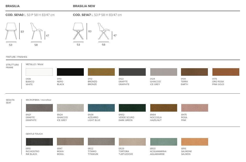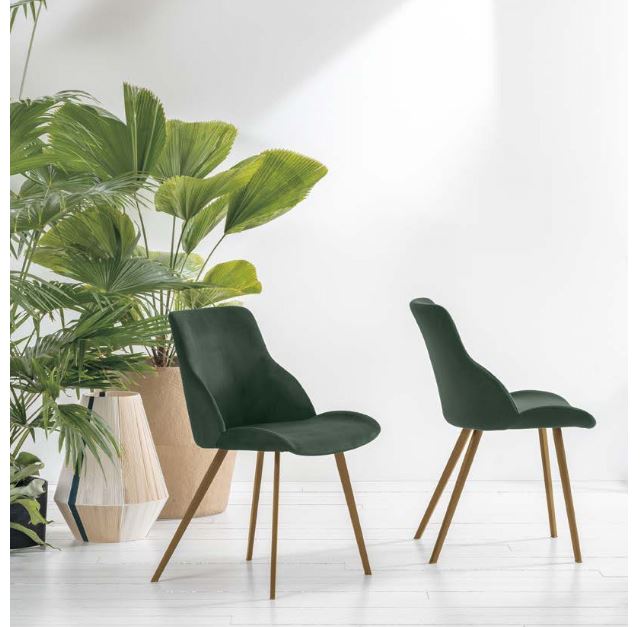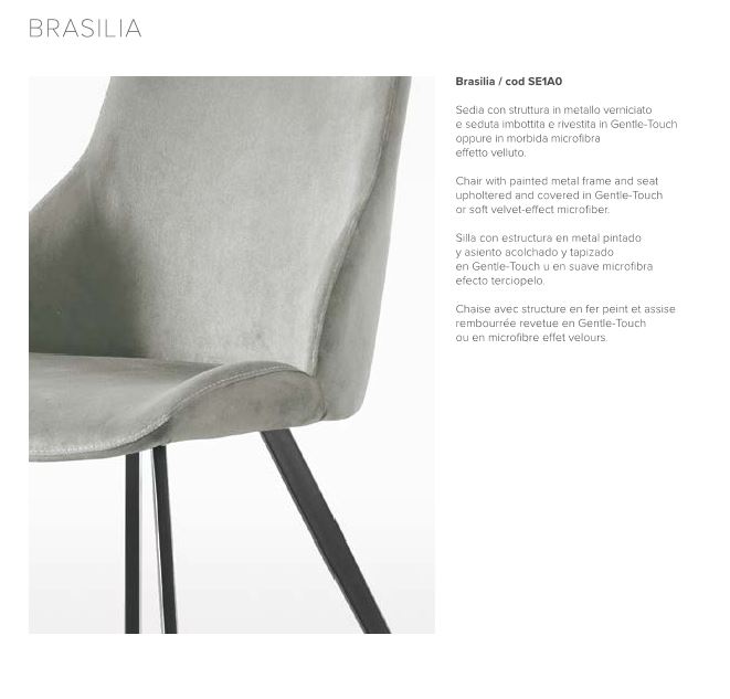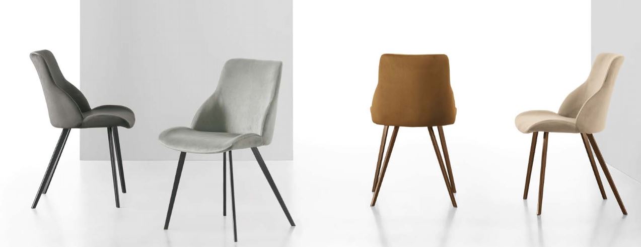 Sedia con struttura in metallo verniciato e seduta imbottita e rivestita in Gentle-Touch oppure in morbida microfibra effetto velluto.