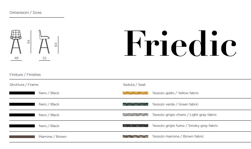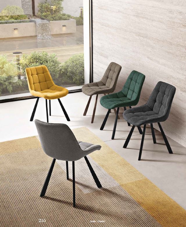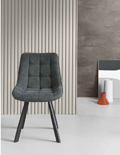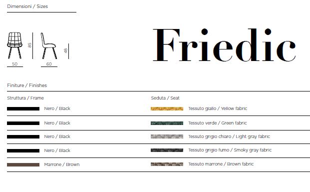Con struttura in metallo verniciato e seduta imbottita in tessuto, la sedia Friedic si distingue per un design