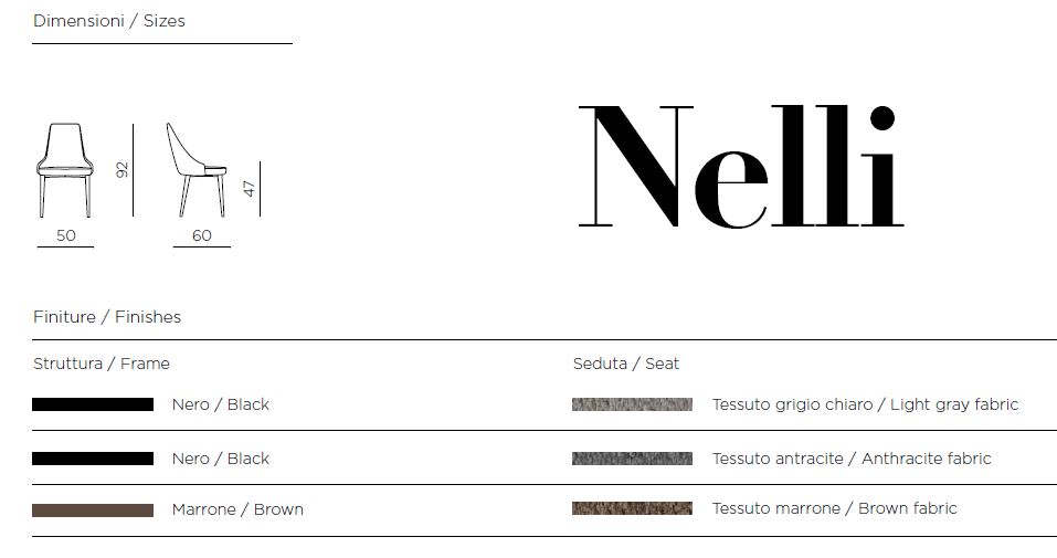Avvolgente, accogliente, elegante. Nelli è una sedia imbottita dal design generoso, con una seduta ampia e confortevole, abbracciata da uno schienale alto. La struttura in metallo verniciato, con gambe solide e ben proporzionate, dona