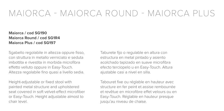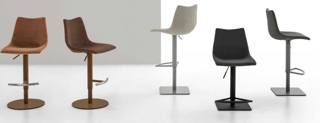 Sgabello regolabile in altezza con struttura in metallo verniciato e seduta imbottita e rivestita in morbida microfibra effetto velluto oppure in Easy-Touch. Altezza regolabile fino a livello sedi