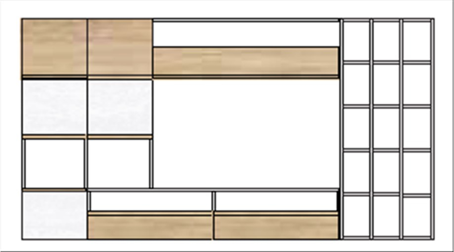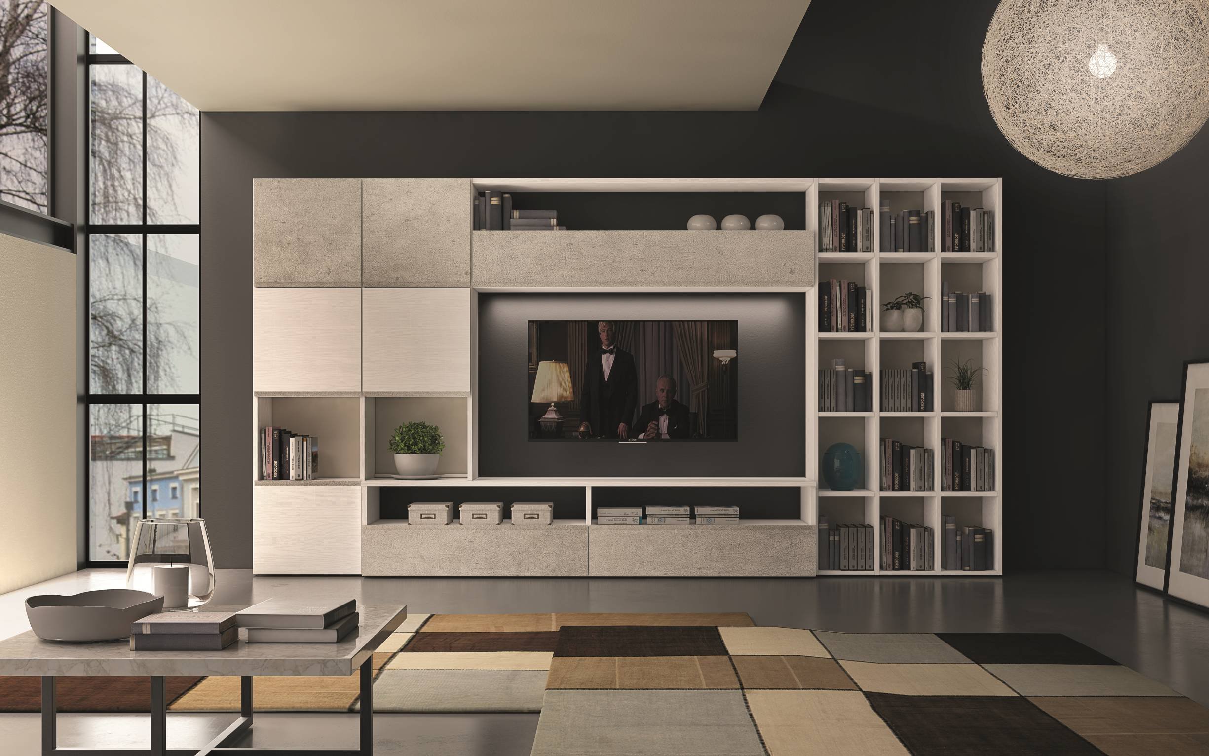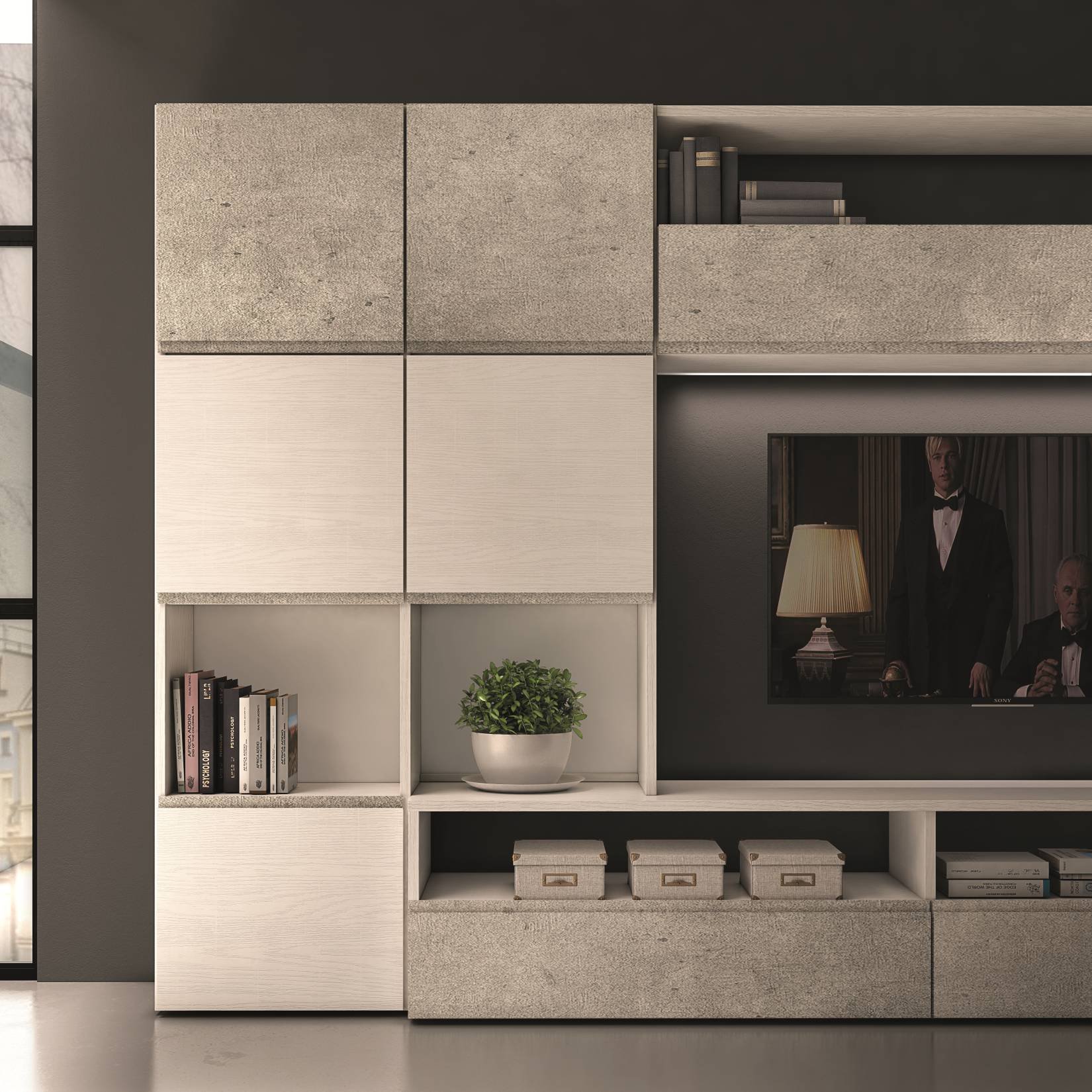 la caratteristica maniglia a gola mono e bicolore danno vita a numerose soluzioni estetiche e compositive capaci di arredare lo spazio di piccoli e grandi ambienti living. Il gioco sapiente di pieni e vuoti permette di mostrare e al contempo contenere e il vano centrale dedicato al posizionamento della tv diventa protagonista