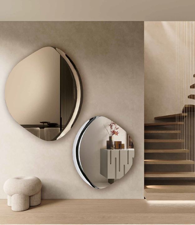 SPECCHIO SAGOMATO CON SEMI CORNICE IN VETRO FUSO, DISPONBILE IN DUE COLORI E TRE DIMENSIONI