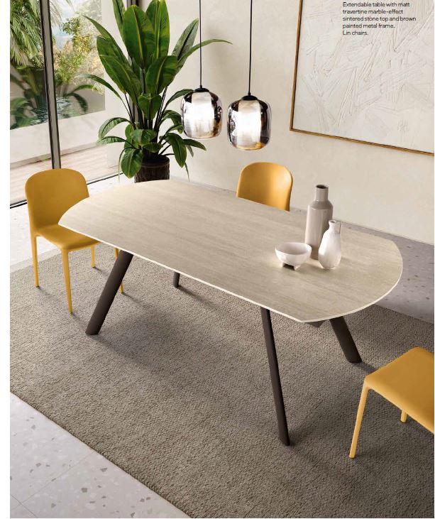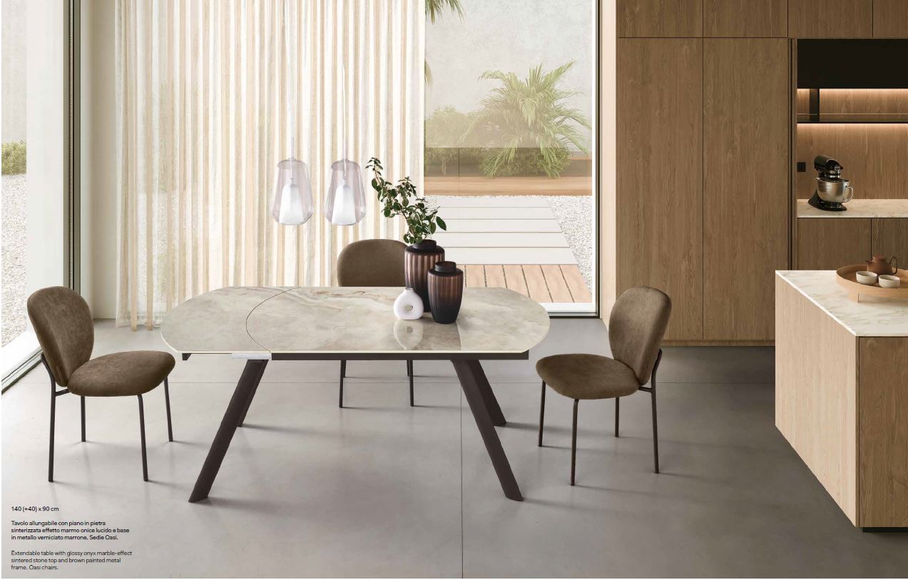 Tavolo allungabile con un’allunga laterale da 40 cm. Base in metallo verniciato e piano in pietra sinterizzata effetto marmo.