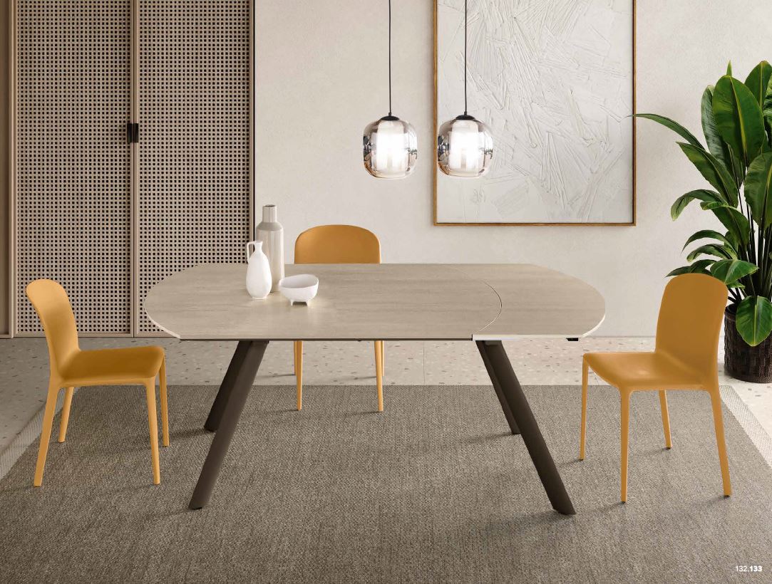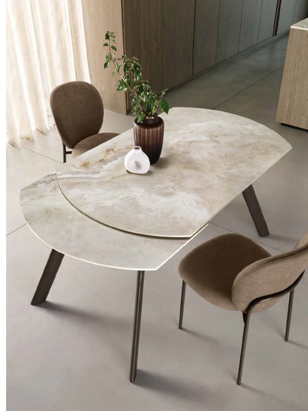 Tavolo allungabile con un’allunga laterale da 40 cm. Base in metallo verniciato e piano in pietra sinterizzata effetto marmo.