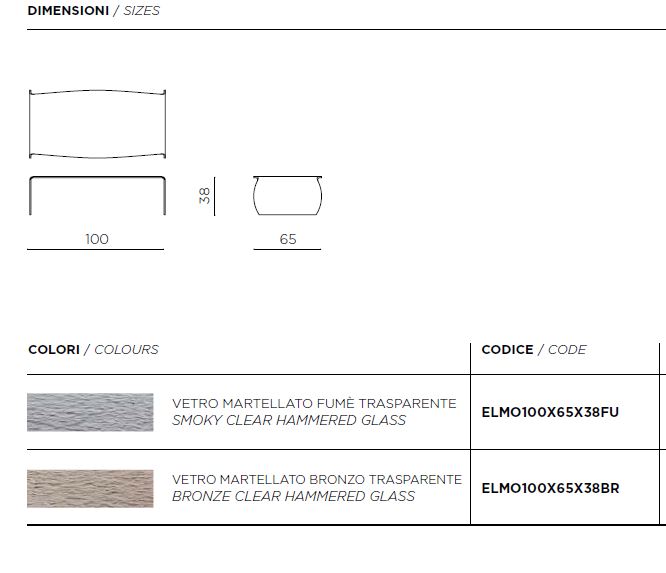 Come Giano, anche Elmo è realizzato in un’unica lastra di vetro trasparente curvato con finitura effetto martellato. A