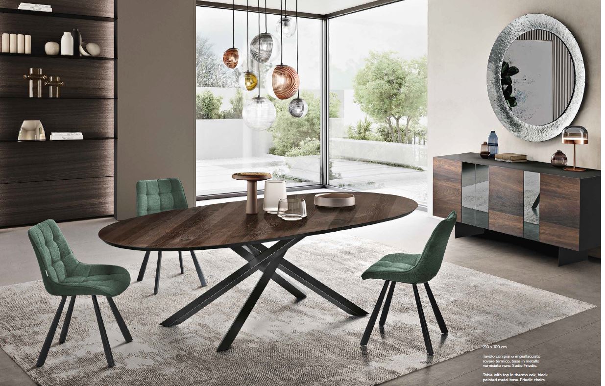 Il basamento in metallo verniciato, composto da quattro gambe che si incrociano con un disegno ispirato al gioco dello shangai, dona stabilità e dinamismo alla struttura, diventando un elemento decorativo a tutti gli effetti Ron è ideale per chi cerca un tavolo importante ma