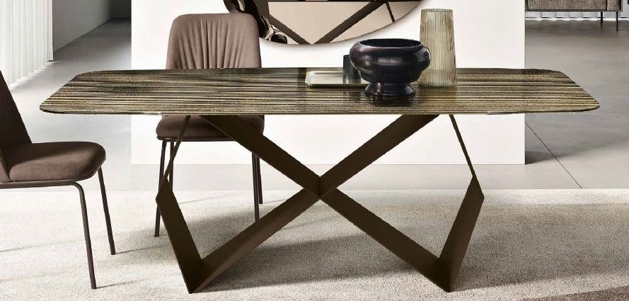 Karl è un tavolo che cattura lo sguardo grazie al suo basamento in metallo verniciato che si intreccia in un movimento
