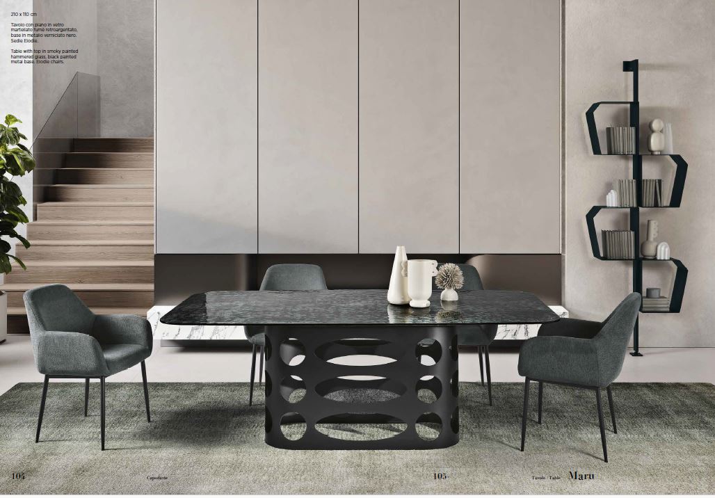 in apparenza, che richiama elementi architettonici e dona al tavolo una forte identità decorativa. Il piano è disponibile in diverse finiture, pensate per adattarsi a gusti e ambienti differenti dal vetro liscio, essenziale e minimale, al vetro rigato
